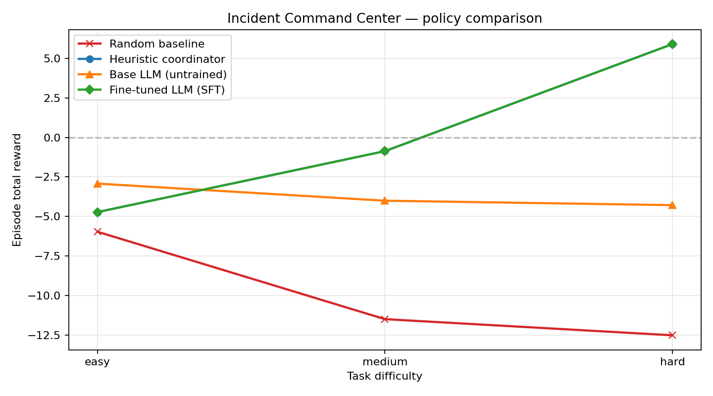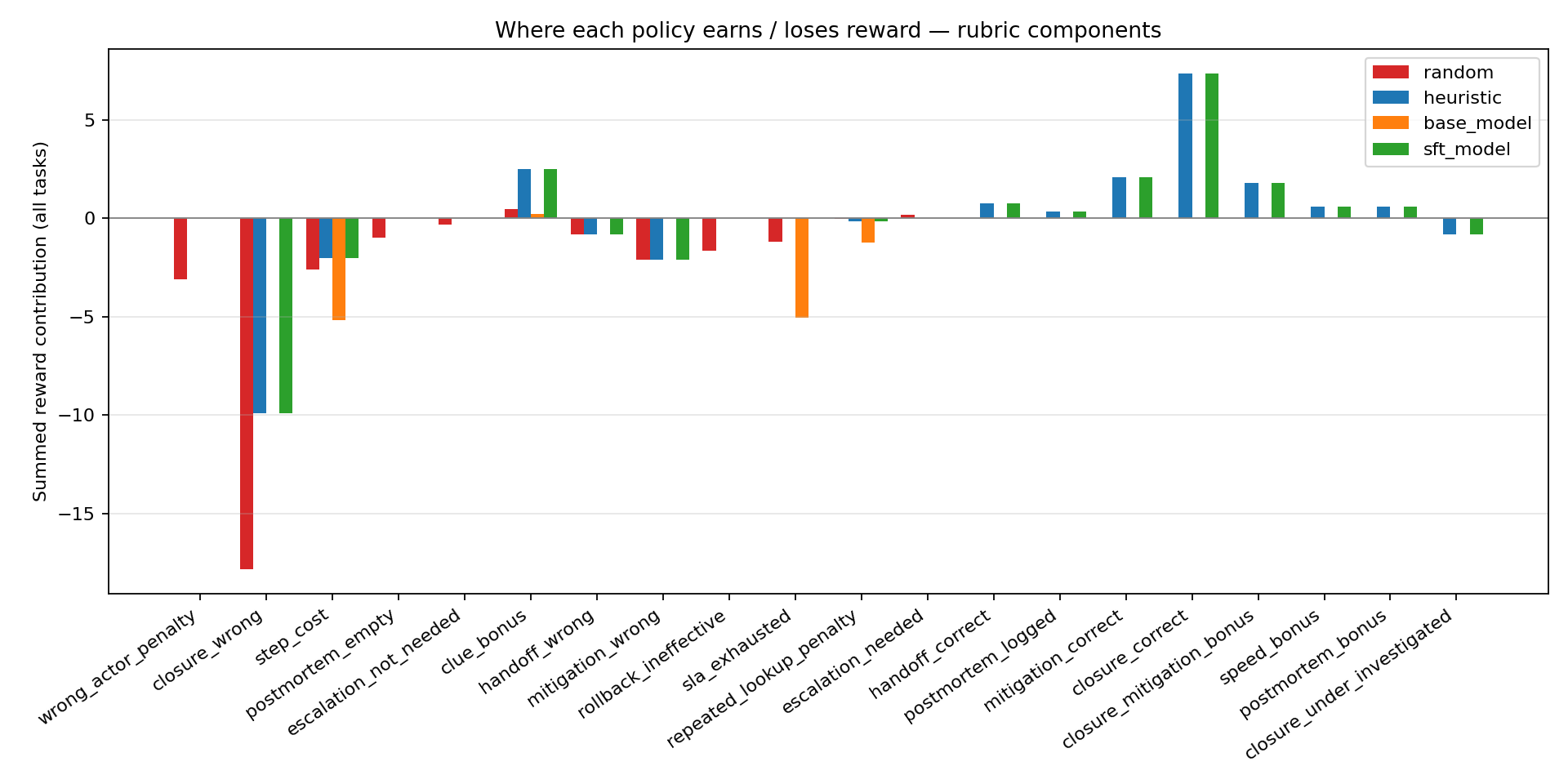 Not "pick the right label." It learned a whole workflow — dig up clues, hand off to the right specialist, apply the correct fix, respect the SLA, file the post-mortem, close the ticket. The rubric makes every piece of that workflow visible as a named reward component, so you can see why the agent earned (or lost) points at every step.