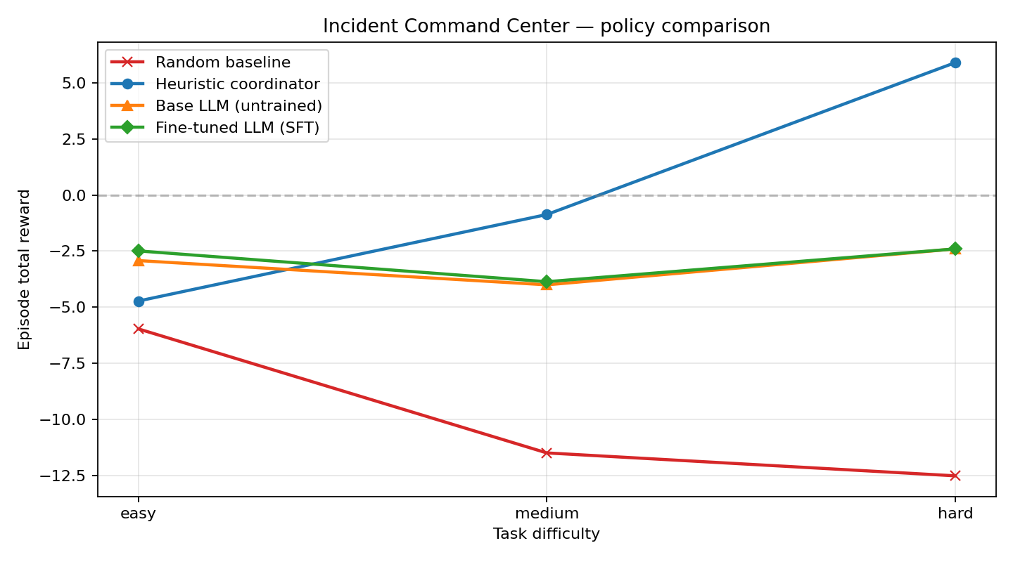 POST /reset — start a new episode (task_name, seed).POST /step — submit an IncidentAction.GET /state — full environment state.GET /healthz — liveness probe.GET /version — build information.GET /env-info — action space, reward model, budgets.GET /metrics — Prometheus-style counters.GET /docs — interactive OpenAPI documentation.GET /artifacts/… — committed training plots & metrics.Each action is gated by the acting role; wrong-actor calls are penalised.